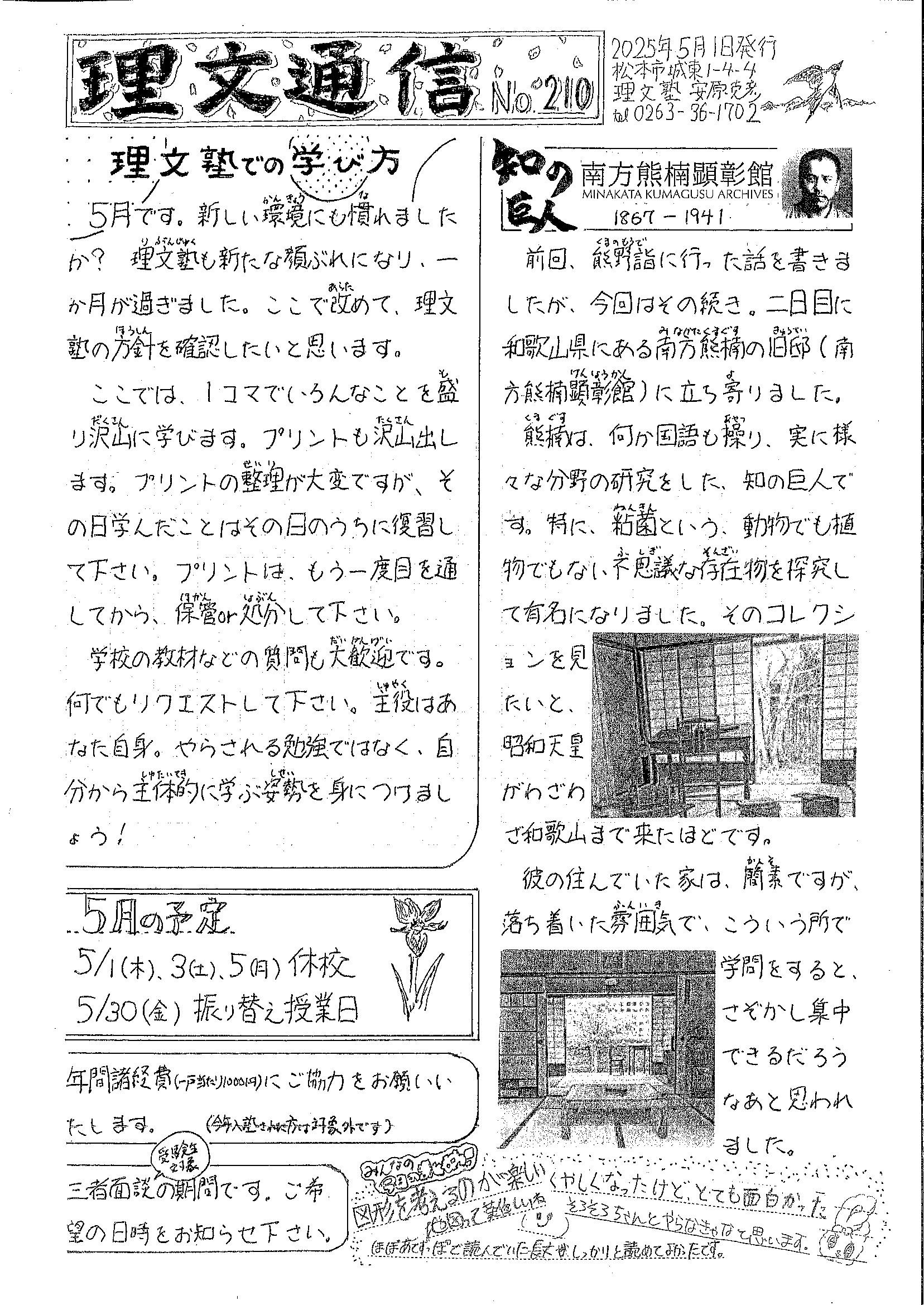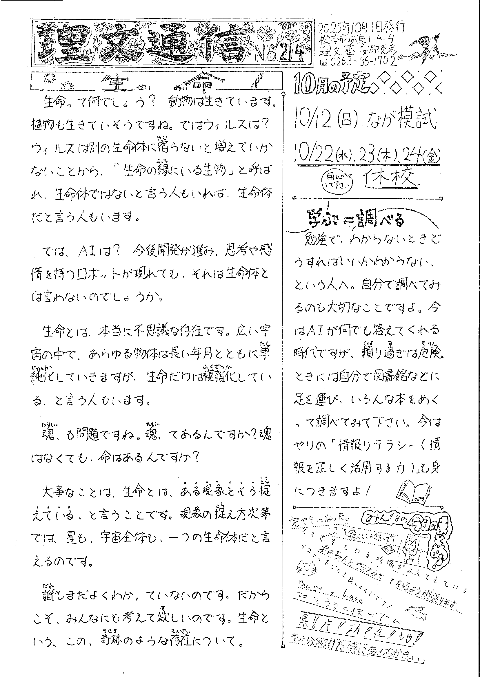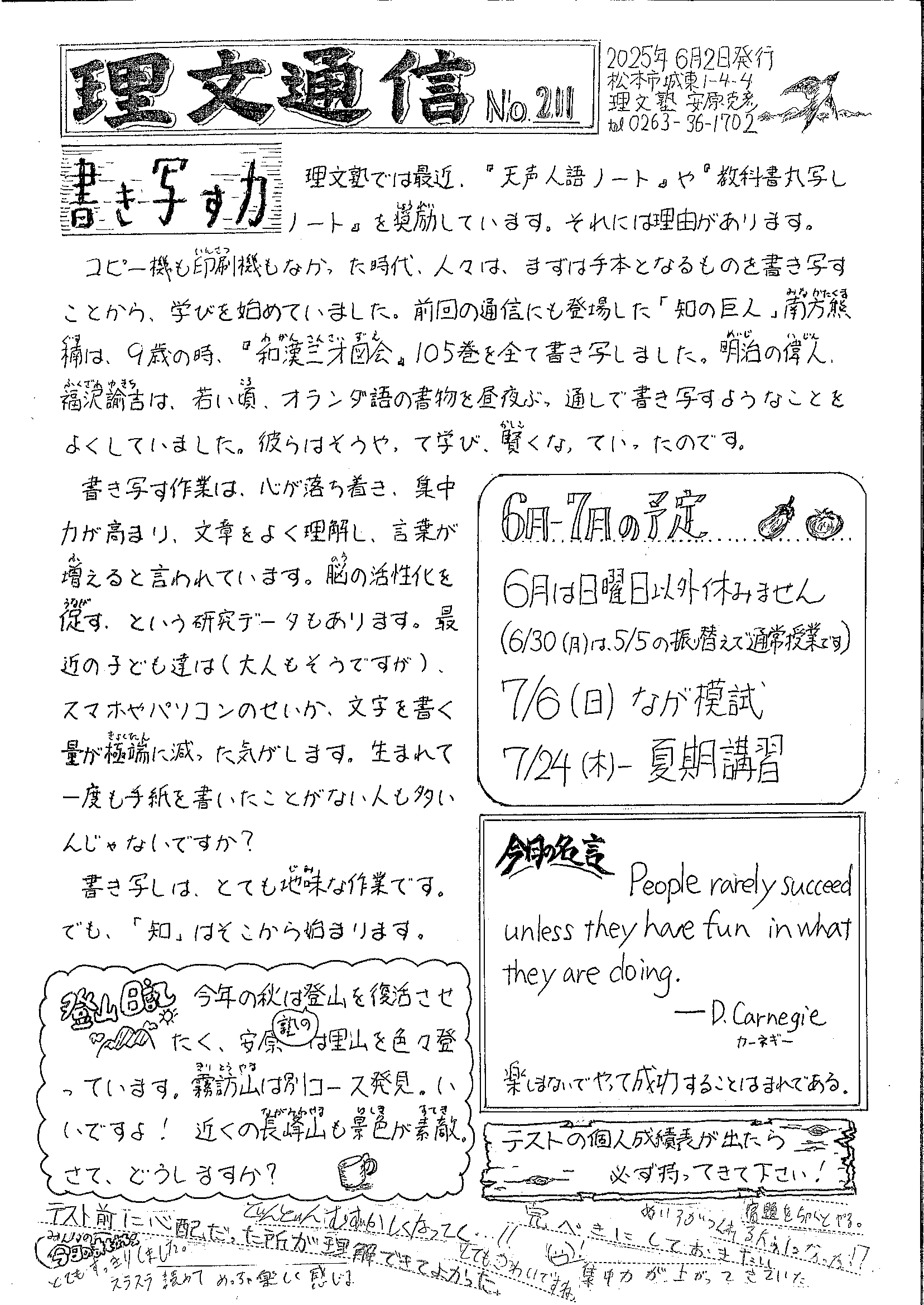 今は何でもデジタルや機械生産でまかなえる時代です。それはそれで利点がありますが、一方で、例えば料理の世界では、手作りのものは味わい深く、体にも良いとされています。だとすれば、頭に入れる知識や情報も、そうでないはずがあるでしょうか? とりわけ成長期の子どもたちには、その大切さを感じます。自分たちでも作れると感じさせるのも、大事な教育だと思います。毎月発行する「理文通信」をいまだに手書きにしている理由も、そこにあります。