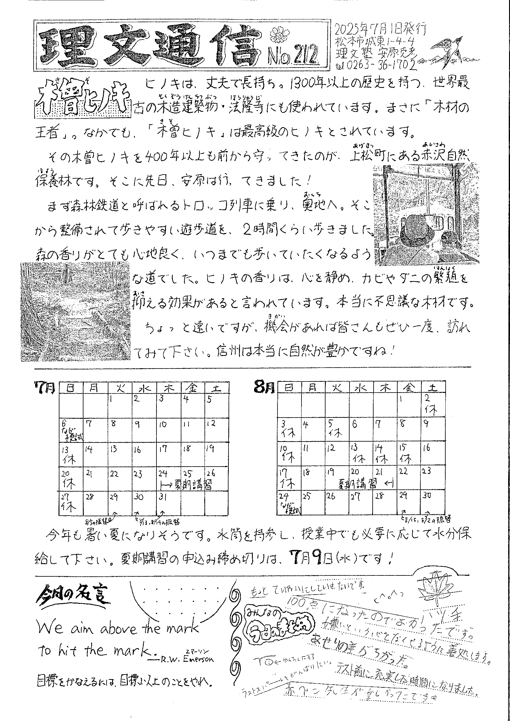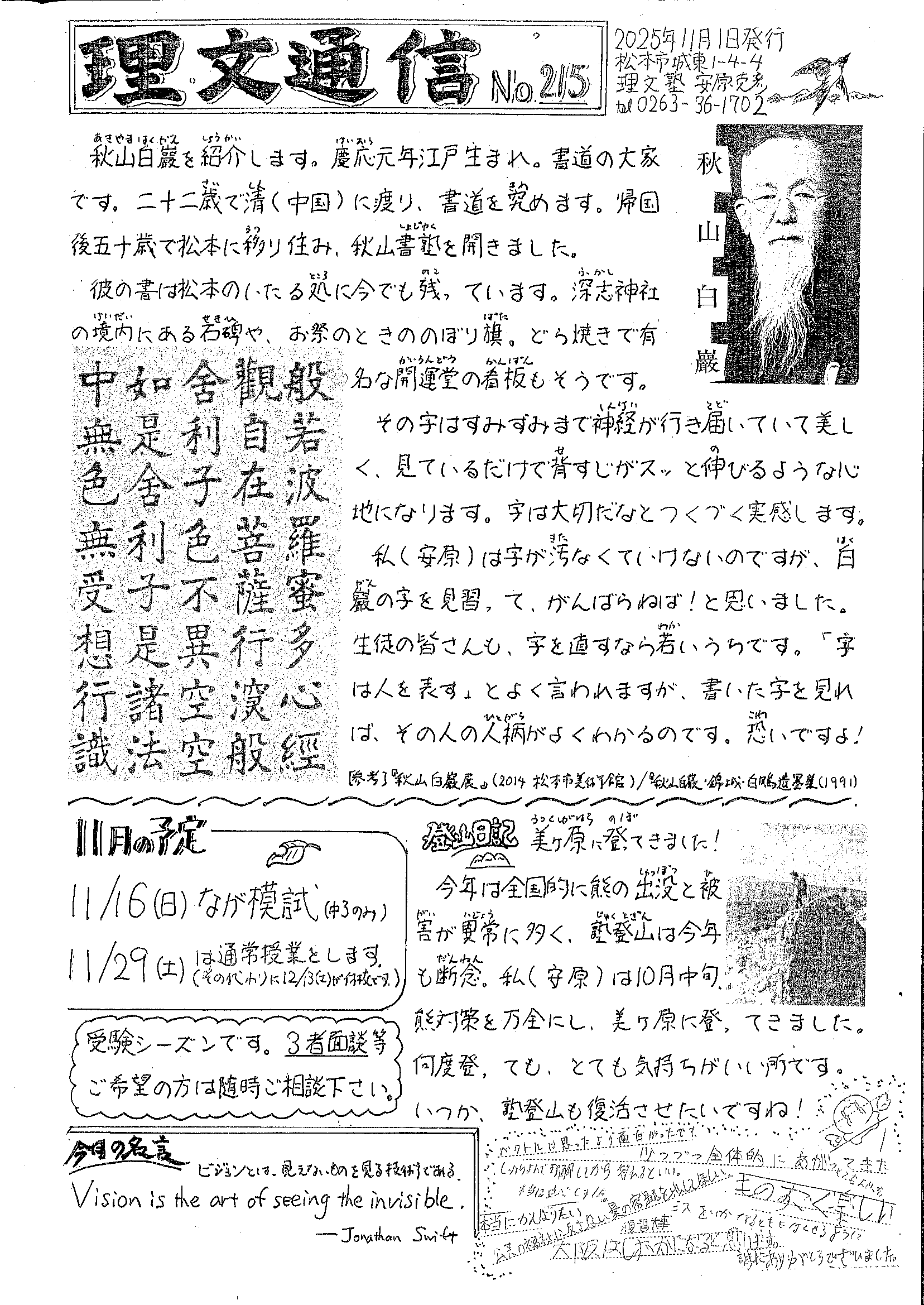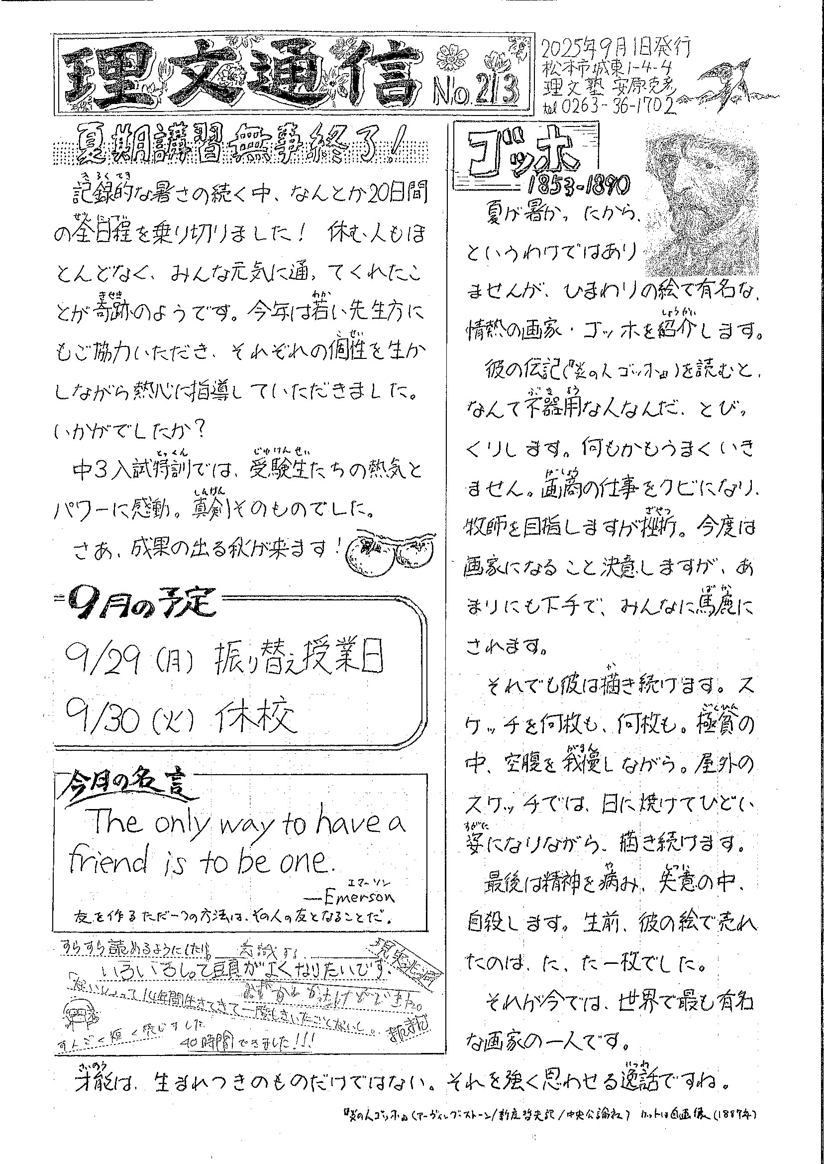 今は何でもデジタルや機械生産でまかなえる時代です。それはそれで利点がありますが、一方で、例えば料理の世界では、手作りのものは味わい深く、体にも良いとされています。だとすれば、頭に入れる知識や情報も、そうでないはずがあるでしょうか? とりわけ成長期の子どもたちには、その大切さを感じます。自分たちでも作れると感じさせるのも、大事な教育だと思います。毎月発行する「理文通信」をいまだに手書きにしている理由も、そこにあります。