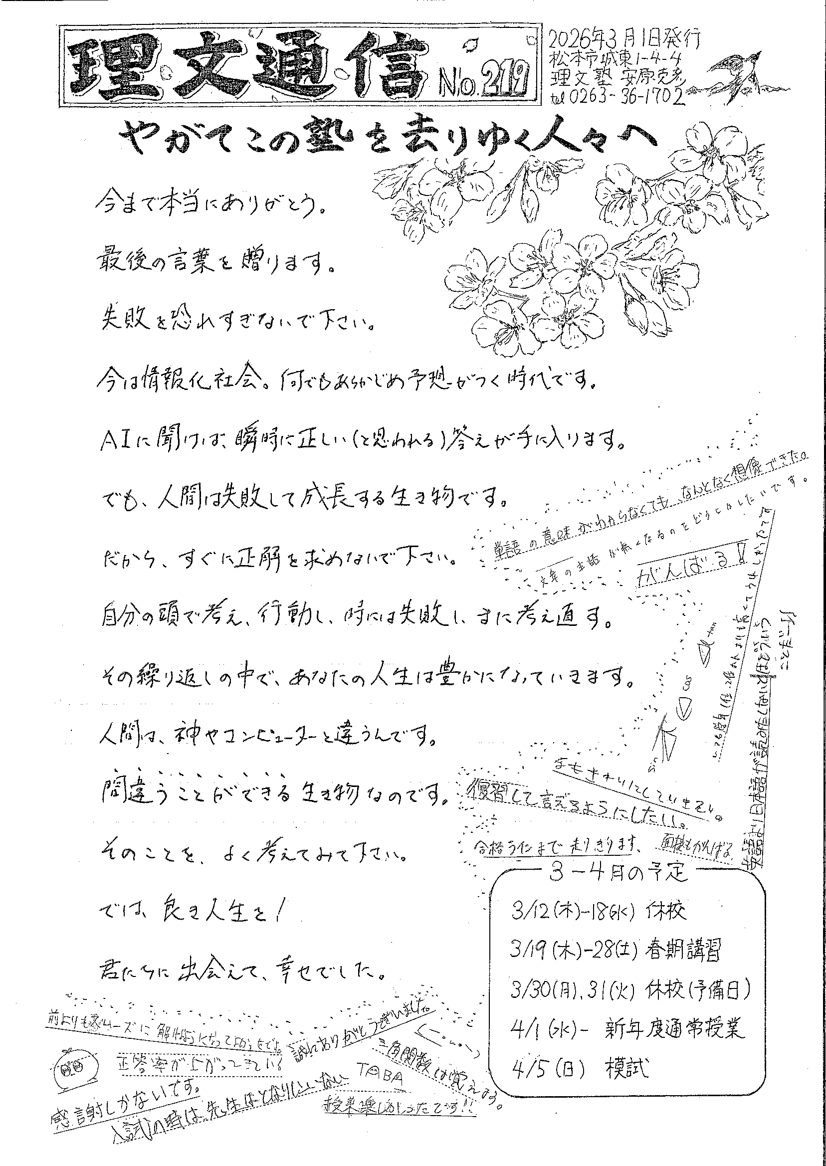 今は何でもデジタルや機械生産でまかなえる時代です。それはそれで利点がありますが、一方で、例えば料理の世界では、手作りのものは味わい深く、体にも良いとされています。だとすれば、頭に入れる知識や情報も、そうでないはずがあるでしょうか? とりわけ成長期の子どもたちには、その大切さを感じます。自分たちでも作れると感じさせるのも、大事な教育だと思います。毎月発行する「理文通信」をいまだに手書きにしている理由も、そこにあります。